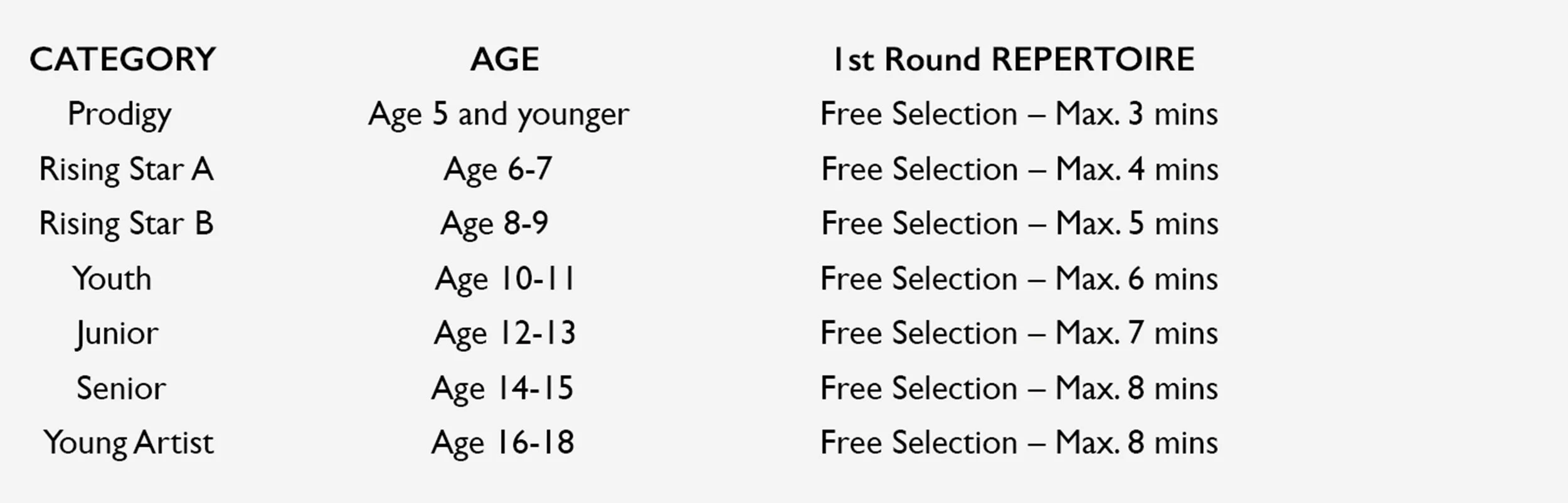 All pieces must be performed by memory. The deadline for first round program changes is May 15th, 2025. The pieces may be performed with or without repeats, at competitor’s decision.