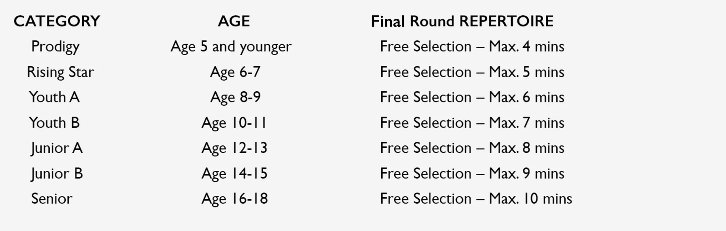 All pieces must be performed by memory. The deadline for final round program changes is July 15th, 2025. The pieces may be performed with or without repeats, at competitor’s decision.